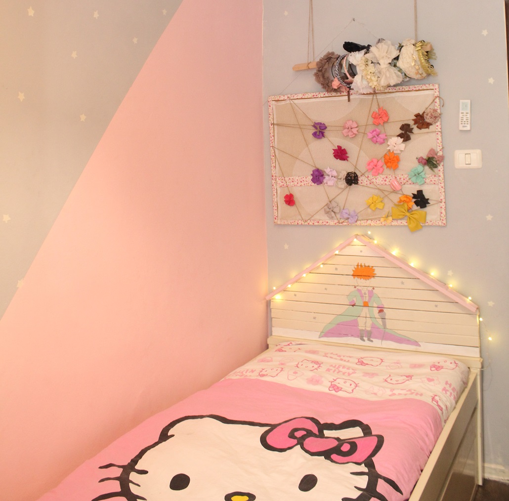 2)מעל המיטה מתחנו מסקנטייפ אלכסוני וצבענו משולש ורוד…