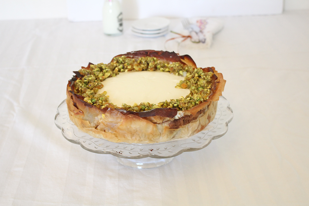 פותחים את דלת התנור ומניחים לעוגה להצטנן מעט, מוציאים לטמפרטורת החדר לצינון מלא. מעבירים למקרר להתייצבות, מעטרים את העוגה סביב בפיסטוקים קצוצים לפני ההגשה.
