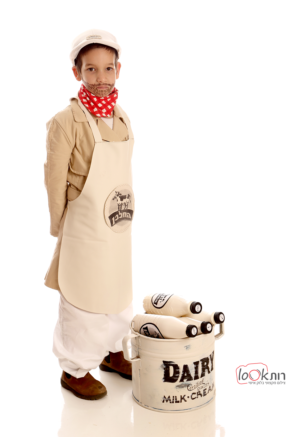 לחלבן תפרתי סינר מבד סקאי. (הנחתי את הבד על סינר שלי וגזרתי מסביב. לא צריך אפילו מכפלת)